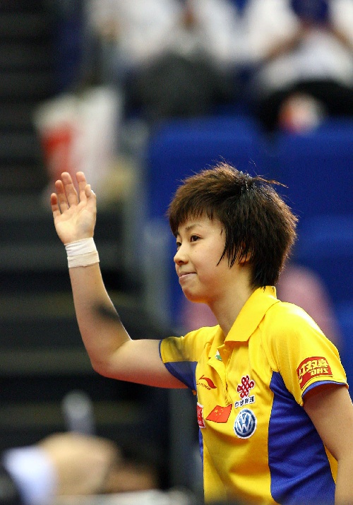 横滨,2009年5月5日 (体育)(1)乒乓球——世乒赛:张怡宁战胜郭跃 5月5日,张怡宁在夺冠后向观众挥手致意。当日,在日本横滨举行的第50届世乒赛女单决赛中,中国选手张怡宁以4比2战胜队友郭跃,夺得冠军。 新华社记者毕明明摄