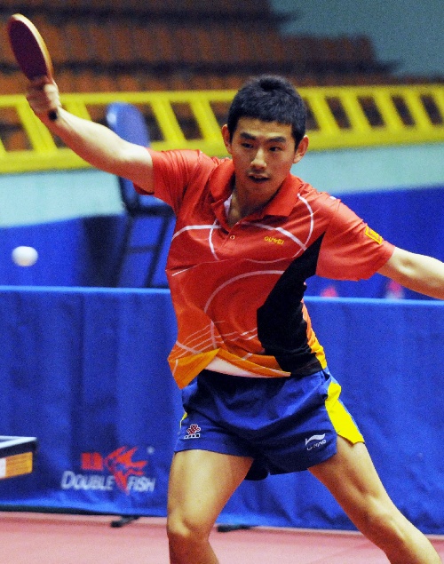 6月18日,广州双鱼队选手金义雄在比赛中。当日,在唐山举行的2009年中国乒乓球俱乐部甲A比赛(第二站)男子团体第一阶段比赛中,广州双鱼队以3比1战胜山东胜利东胜队。 新华社记者王民摄