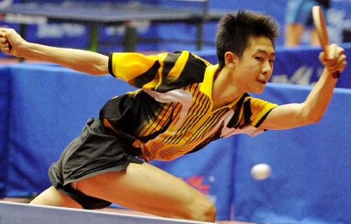 6月18日,北京铜牛(红)队选手李天宇在比赛中回球。当日,在2009年中国乒乓球俱乐部甲A比赛(第二站)男子团体第一阶段比赛中,北京铜牛(红)队以3比2战胜江苏队。 新华社记者杨世尧摄