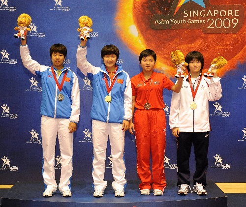 新加坡,2009年7月6日 (体育)(8)亚青会——中国选手包揽亚青会乒乓球女单冠亚军 7月6日,冠军得主中国选手陈梦(左二)、亚军得主顾玉婷(左一)与并列第三名的朝鲜和日本选手在领奖台上合影。当日,在新加坡进行的首届亚洲青年运动会乒乓球女子单打决赛中,中国选手陈梦、顾玉婷包揽冠亚军。 新华社记者陈铎摄