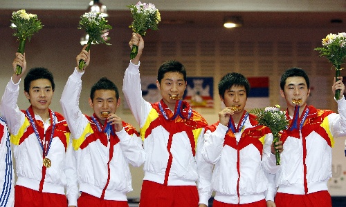 贝尔格莱德,2009年7月7日 (大运会)(1)乒乓球——中国队夺得男子团体冠军 7月7日,中国队队员在领奖台上。当日,在贝尔格莱德举行的第25届世界大学生运动会乒乓球男子团体决赛中,中国队以3比0战胜法国队,夺得冠军。 新华社记者凡军摄