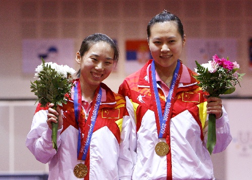 贝尔格莱德,2009年7月9日 (大运会)(1)乒乓球——蔡姗姗/戴宁阳夺得女双冠军 7月9日,中国选手蔡姗姗(左)/戴宁阳在领奖台上。当日,在贝尔格莱德举行的第25届世界大学生运动会乒乓球女子双打决赛中,蔡姗姗/戴宁阳以4比3战胜队友刘娟/马越斐,夺得冠军。 新华社记者凡军摄
