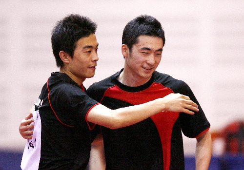 贝尔格莱德,2009年7月9日 (大运会)(3)乒乓球——中国选手男双夺冠 7月9日,中国选手崔庆磊(右)/李洋赛后庆祝胜利。当日,在贝尔格莱德举行的第25届世界大学生运动会乒乓球男子双打决赛中,崔庆磊/李洋以4比2战胜法国选手,夺得冠军。 新华社记者凡军摄