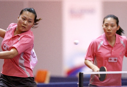 贝尔格莱德,2009年7月9日 (大运会)(2)乒乓球——蔡姗姗/戴宁阳夺得女双冠军 7月9日,中国选手蔡姗姗/戴宁阳(左)在比赛中。当日,在贝尔格莱德举行的第25届世界大学生运动会乒乓球女子双打决赛中,蔡姗姗/戴宁阳以4比3战胜队友刘娟/马越斐,夺得冠军。 新华社记者凡军摄