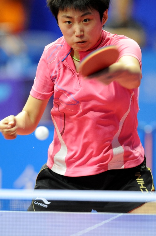 青岛,2009年9月24日   (体育)(12)全运会——乒乓球比赛开赛 9月24日,辽宁队队员郭跃在女子团体小组赛第一阶段比赛中以3比1战胜天津队队员李艳。当日,第十一届全运会乒乓球比赛在山东青岛开赛。 新华社记者韩瑜庆摄