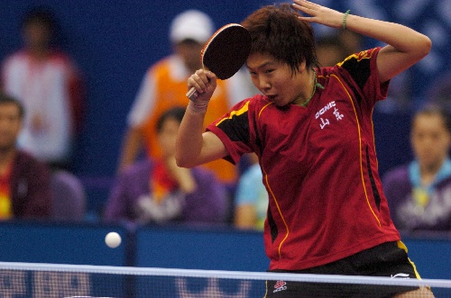 青岛,2009年9月25日 (体育)(5)乒乓球——全运会:李晓霞胜曹幸妮 9月25日,山东队选手李晓霞在比赛中。当日,在山东青岛举行的第十一届全运会乒乓球女子团体小组赛中,李晓霞以3比2战胜广东队选手曹幸妮。 新华社记者郭晨摄