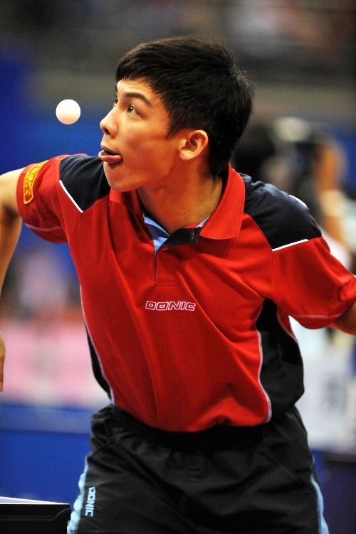 青岛,2009年9月25日 (体育)(4)乒乓球——全运会团体赛:陈玘胜张超 9月25日,江苏代表队球员陈玘在比赛中发球。当日,在山东青岛举行的第十一届全运会乒乓球男子团体比赛中,陈玘以3比0战胜广东选手张超。 新华社记者陈晔华摄