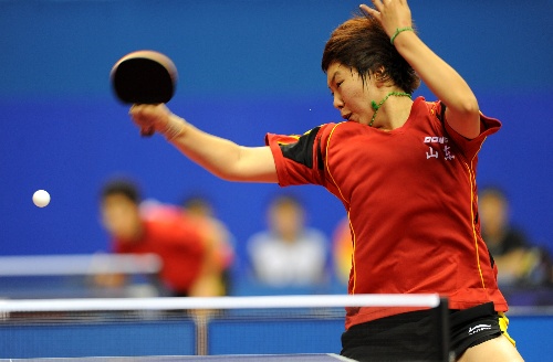 青岛,2009年9月26日 (体育)(2)乒乓球——全运会:山东队晋级女团四强 9月26日,山东队选手李晓霞在比赛中回球。当日,在第十一届全运会乒乓球女子团体1/4决赛中,山东队以3比0战胜山西队,晋级四强。 新华社记者韩瑜庆摄