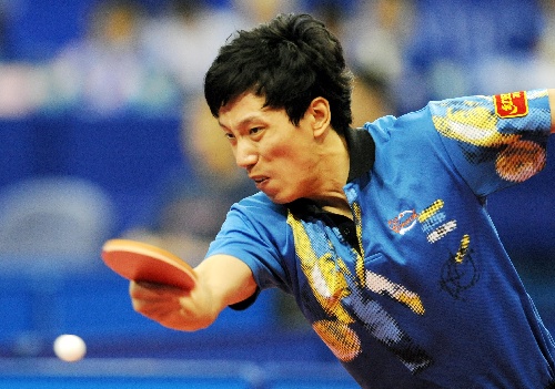 青岛,2009年9月27日 (体育)(6)乒乓球——全运会:解放军队晋级男子团体决赛 9月27日,解放军队选手雷振华在比赛中回球。最终,雷振华以3比1战胜山东队选手周鑫。当日,在山东青岛举行的第十一届全运会乒乓球男子团体半决赛中,解放军队以3比0战胜山东队,晋级决赛。 新华社记者朱峥摄