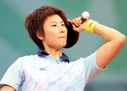 青岛,2009年9月28日   (体育)(6)乒乓球——全运会:北京队获女团冠军 9月28日,北京队选手丁宁在比赛中发球。最终,丁宁以3比0战胜山东队选手李晓霞。当日,在青岛举行的第十一届全国运动会乒乓球女子团体决赛中,北京队以3比0战胜山东队,荣获冠军。 新华社记者朱峥摄