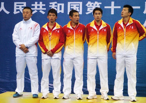 青岛,2009年9月28日 (体育)(9)乒乓球——全运会男团决赛赛况 9月28日,广东队队员在领奖台上。当日,在青岛举行的第十一届全国运动会乒乓球男子团体决赛中,广东队以2比3不敌解放军队,获得亚军。 新华社记者郭晨摄