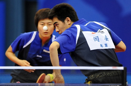 青岛,2009年9月29日 (体育)(2)乒乓球——全运会:北京队选手闫安/丁宁晋级混双四强 9月29日,北京队选手闫安(右)在比赛中发球。当日,在青岛举行的第十一届全国运动会乒乓球混合双打1/4决赛中,闫安/丁宁以3比0战胜四川队选手许锐锋/聂维,晋级半决赛。 新华社记者韩瑜庆摄