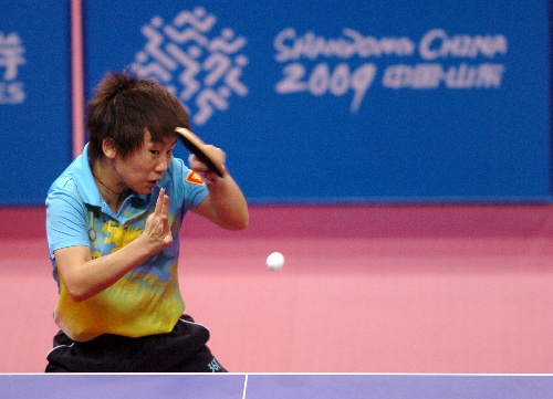 青岛,2009年9月29日 (体育)(2)乒乓球——全运会:蔡赛胜木子 9月29日,蔡赛在比赛中。当日,在山东青岛举行的第十一届全运会乒乓球女子单打比赛中,广东队选手蔡赛以4比2战胜解放军队选手木子,晋级下一轮。 新华社记者郭晨摄