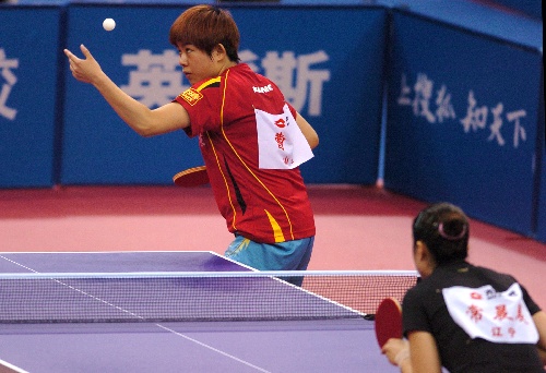青岛,2009年9月29日 (体育)(4)乒乓球——全运会:曹臻胜常晨晨 9月29日,山东选手曹臻(左)在比赛中发球。当日,在山东青岛举行的第十一届全运会乒乓球女子单打比赛中,曹臻以4比2战胜辽宁队选手常晨晨,晋级下一轮。 新华社记者郭晨摄