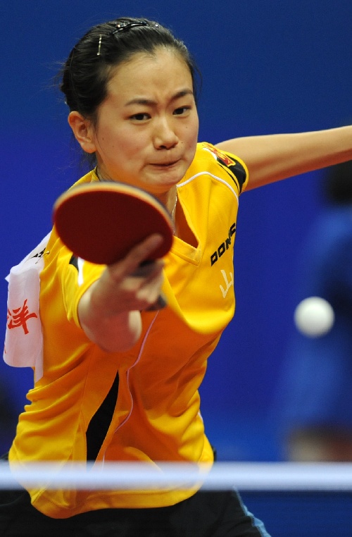青岛,2009年9月29日 (体育)(3)乒乓球——全运会:彭陆洋胜罗玥 9月29日,彭陆洋在比赛中回球。当日,在山东青岛举行的第十一届全运会乒乓球女子单打比赛中,山东选手彭陆洋以4比3战胜湖北选手罗玥。 新华社记者韩瑜庆摄