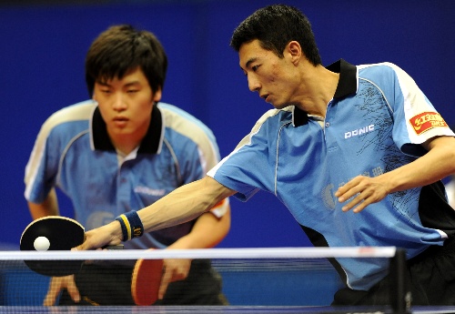 青岛,2009年9月29日 (体育)(3)乒乓球——全运会:男双赛况 9月29日,天津队选手李平(右)在比赛中回球。当日,在山东青岛举行的第十一届全运会乒乓球男子双打第一轮比赛中,天津队选手郝帅/李平以3比2战胜北京队选手闫安/杨策,晋级下一轮。 新华社记者韩瑜庆摄