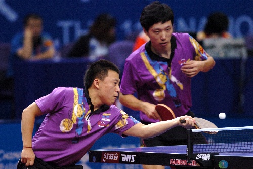 青岛,2009年9月30日 (体育)(2)乒乓球——全运会:男双赛况 9月30日,柳洋(左)在比赛中回球。当日,在山东青岛举行的第十一届全运会乒乓球男子双打第二轮比赛中,解放军队选手雷振华/柳洋以2比3负于天津队选手郝帅/李平战胜,无缘四强。 新华社记者郭晨摄