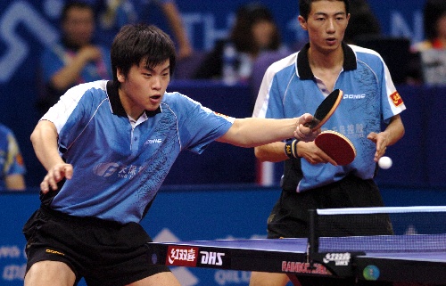 青岛,2009年9月30日 (体育)(3)乒乓球——全运会:郝帅/李平晋级男双四强 9月30日,天津队选手郝帅(左)在比赛中回球。当日,在山东青岛举行的第十一届全运会乒乓球男子双打第二轮比赛中,天津队选手郝帅/李平以3比2战胜解放军队选手雷振华/柳洋,晋级四强。 新华社记者郭晨摄