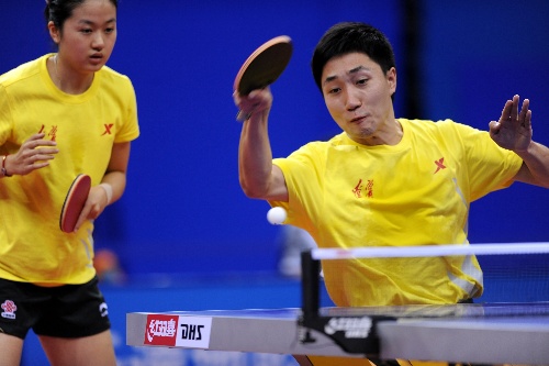 青岛,2009年9月30日 (体育)(1)乒乓球——全运会:翟一鸣/常晨晨挺进混双决赛 9月30日,辽宁队选手翟一鸣(右)在比赛中回球。当日,在青岛举行的第十一届全国运动会乒乓球混合双打半决赛中,辽宁队选手翟一鸣/常晨晨以4比1战胜北京队选手闫安/丁宁,晋级决赛。 新华社记者韩瑜庆摄