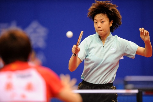青岛,2009年9月30日 (体育)(4)乒乓球——全运会:张怡宁战胜蔡赛 9月30日,北京队选手张怡宁在比赛中回球。当日,在青岛举行的第十一届全国运动会乒乓球女子单打第三轮比赛中,张怡宁以4比0战胜广东队选手蔡赛,晋级下一轮。 新华社记者韩瑜庆摄