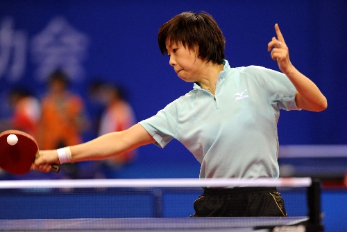 青岛,2009年9月30日 (体育)(1)乒乓球——全运会:张怡宁战胜蔡赛 9月30日,北京队选手张怡宁在比赛中。当日,在青岛举行的第十一届全国运动会乒乓球女子单打第三轮比赛中,张怡宁以4比0战胜广东队选手蔡赛,晋级下一轮。 新华社记者韩瑜庆摄