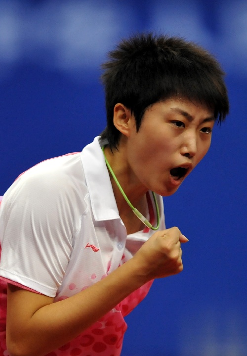 青岛,2009年9月30日 (体育)(2)乒乓球——全运会女单:郭跃胜饶静文 9月30日,郭跃在比赛中庆祝得分。当日,在山东青岛举行的第十一届全运会乒乓球女子单打比赛中,辽宁队选手郭跃以4比1战胜湖北队选手饶静文。 新华社记者陈晔华摄