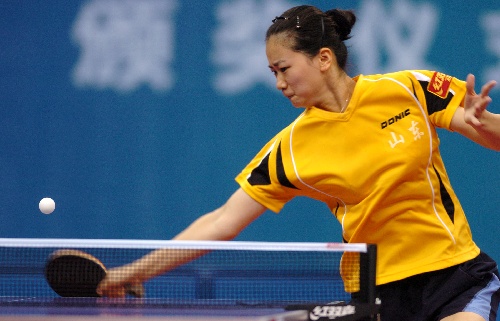 青岛,2009年9月30日 (体育)(2)乒乓球——全运会:张怡宁胜彭陆洋 9月30日,彭陆洋在比赛中。当日,在山东青岛举行的第十一届全运会乒乓球女子单打比赛中,山东队选手彭陆洋以1比4不敌北京队选手张怡宁。 新华社记者郭晨摄