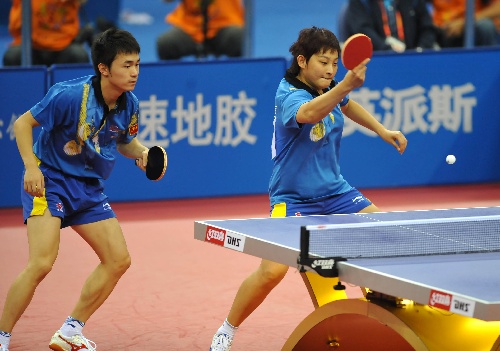 青岛,2009年9月30日 (体育)(4)乒乓球——全运会:闫安/丁宁获混双铜牌 9月30日,解放军队选手徐克/刘纯(右)在比赛中。当日,在青岛举行的第十一届全国运动会乒乓球混合双打季军争夺战中,徐克/刘纯以1比3负于北京队选手闫安/丁宁。 新华社记者陈晔华摄
