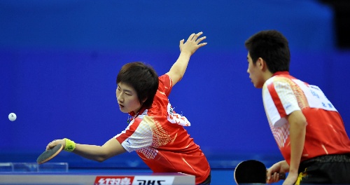 青岛,2009年9月30日 (体育)(3)乒乓球——全运会:闫安/丁宁获混双铜牌 9月30日,北京队选手闫安/丁宁(左)在比赛中。当日,在青岛举行的第十一届全国运动会乒乓球混合双打季军争夺战中,闫安/丁宁以3比1战胜解放军队选手徐克/刘纯,获得铜牌。 新华社记者陈晔华摄