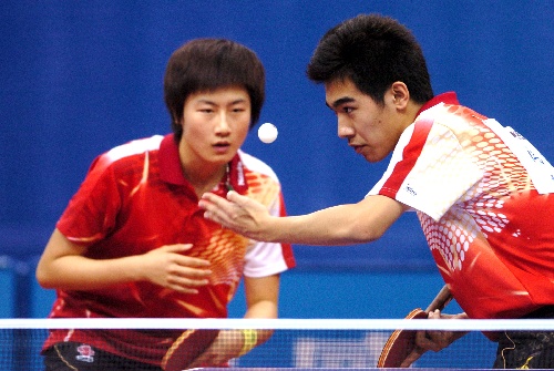 青岛,2009年9月30日 (体育)(1)乒乓球——全运会:闫安/丁宁获混双铜牌 9月30日,北京队选手闫安(右)/丁宁在比赛中。当日,在青岛举行的第十一届全国运动会乒乓球混合双打季军争夺战中,闫安/丁宁以3比1战胜解放军队选手徐克/刘纯,获得铜牌。 新华社记者郭晨摄