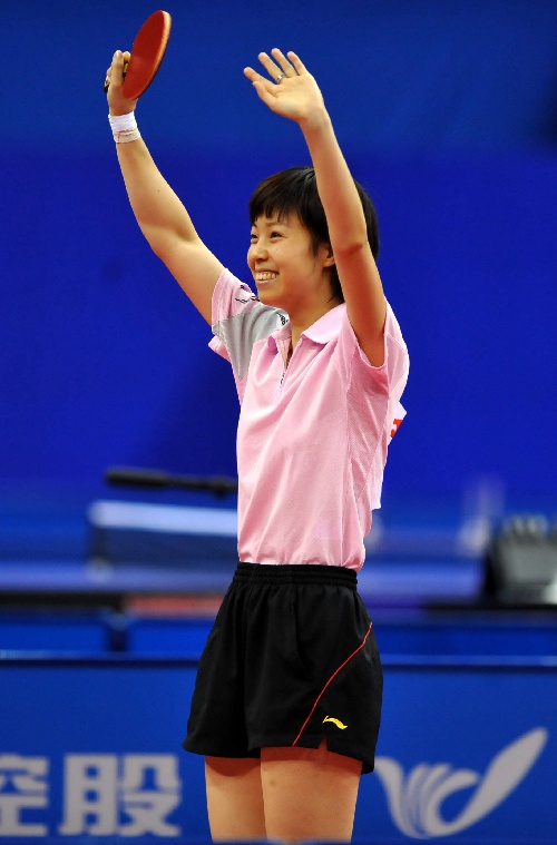 10月1日,张怡宁在获胜后向观众致意。当日,在青岛举行的第十一届全国运动会乒乓球女子单打决赛中,北京队选手张怡宁以4比1战胜辽宁队选手郭跃,获得金牌。 新华社记者陈晔华摄