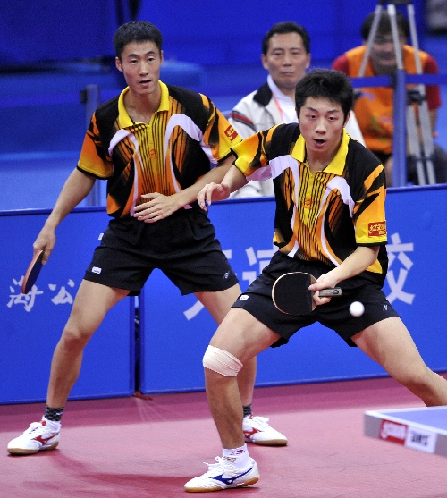 10月1日,王励勤/许昕(右)在比赛中回球。当日,在青岛举行的第十一届全国运动会乒乓球男子双打决赛中,上海队选手王励勤/许昕以4比3战胜天津队选手郝帅/李平,获得金牌。 新华社记者范长国摄