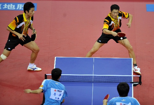 10月1日,上海队选手王励勤(右)/许昕在比赛中。当日,在青岛举行的第十一届全国运动会乒乓球男子双打决赛中,王励勤/许昕以4比3战胜天津队选手郝帅/李平,获得金牌。 新华社记者陈晔华摄