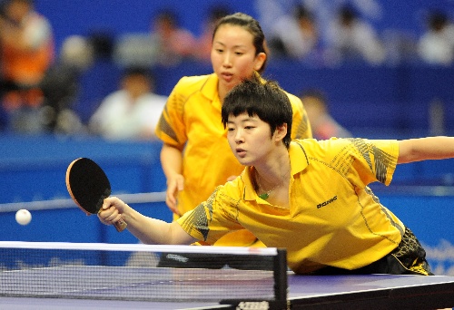 青岛,2009年10月2日 (体育)(1)乒乓球——全运会:刘娟/饶静文挺进女双决赛 10月2日,湖北队选手饶静文(右)在比赛中回球。当日,在青岛举行的第十一届全国运动会乒乓球女子双打半决赛中,湖北队选手刘娟/饶静文以4比1战胜辽宁队选手李佳/李佳燚,进入决赛。 新华社记者朱峥摄