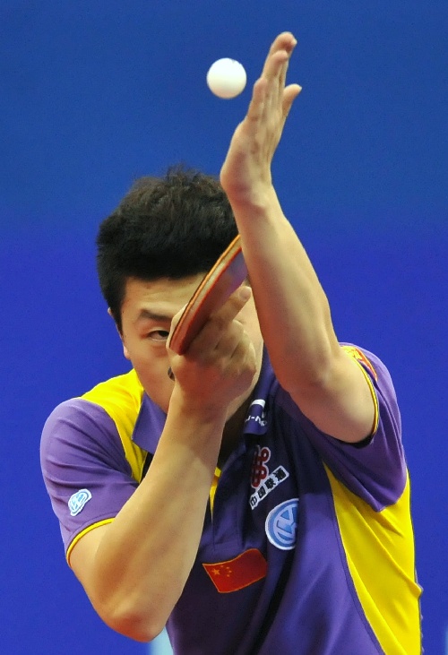 青岛,2009年10月2日 (体育)(2)乒乓球——全运会:马龙挺进男单决赛 10月2日,马龙在比赛中发球。当日,在青岛举行的第十一届全国运动会乒乓球男子单打半决赛中,北京队选手马龙以4比1战胜上海队选手王励勤,进入决赛。 新华社记者陈晔华摄