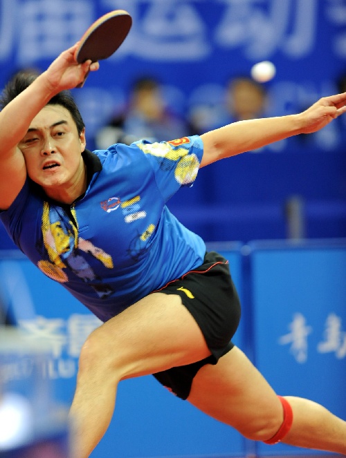 青岛,2009年10月2日 (体育)(10)乒乓球——全运会:王皓获得男单冠军 10月2日,王皓在比赛中回球。当日,在青岛举行的第十一届全国运动会乒乓球男子单打决赛中,解放军队选手王皓以4比2战胜北京队选手马龙,获得冠军。 新华社记者韩瑜庆摄