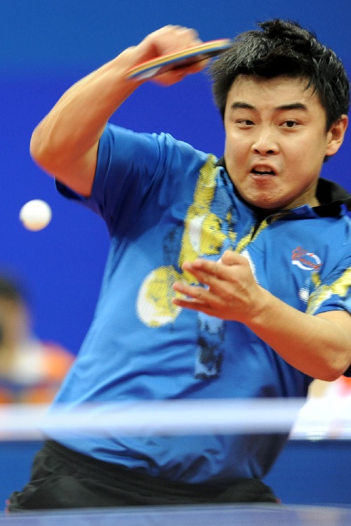 青岛,2009年10月2日 (体育)(11)乒乓球——全运会:王皓获得男单冠军 10月2日,王皓在比赛中回球。当日,在青岛举行的第十一届全国运动会乒乓球男子单打决赛中,解放军队选手王皓以4比2战胜北京队选手马龙,获得冠军。 新华社记者韩瑜庆摄