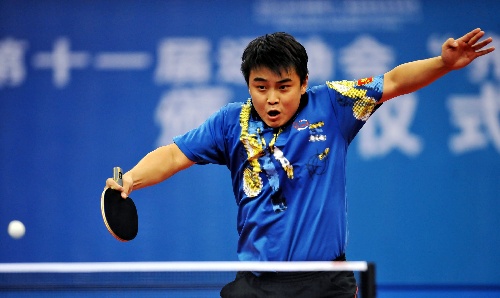 青岛,2009年10月2日 (体育)(4)乒乓球——全运会:王皓获得男单冠军 10月2日,王皓在比赛中回球。当日,在青岛举行的第十一届全国运动会乒乓球男子单打决赛中,解放军队选手王皓以4比2战胜北京队选手马龙,获得冠军。 新华社记者陈晔华摄