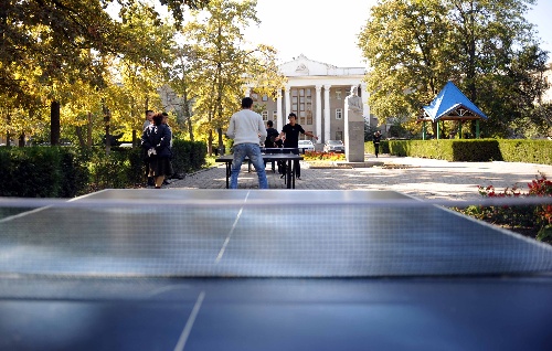 比什凯克,2009年10月15日 (体育)(3)兵乓球风靡比什凯克 10月14日,几名吉尔吉斯斯坦年轻人在比什凯克街头公园玩兵乓球。乒乓球运动在吉尔吉斯斯坦首都比什凯克很受欢迎,在市区的广场或街边开阔地,安放了不少兵乓球桌,方便人们进行比赛和娱乐,并收取一定费用。 新华社记者沙达提摄