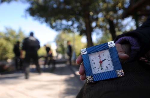 比什凯克,2009年10月15日 (体育)(5)兵乓球风靡比什凯克 10月14日,在比什凯克一处街边兵乓球场地,一名管理者手持小闹钟计时收费。乒乓球运动在吉尔吉斯斯坦首都比什凯克很受欢迎,在市区的广场或街边开阔地,安放了不少兵乓球桌,方便人们进行比赛和娱乐,并收取一定费用。 新华社记者沙达提摄
