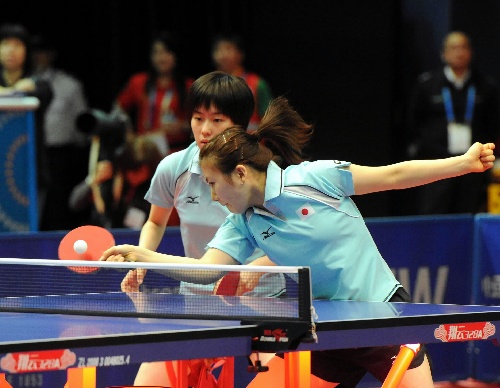 香港,2009年12月7日   (东亚运动会)(4)乒乓球——决赛赛况 12月7日,日本队选手福原爱(前)/石川佳纯在比赛中回球。当日,在中国香港进行的第五届东亚运动会乒乓球女子双打决赛中,福原爱/石川佳纯以4比2战胜队友藤井宽子/若宫三纱子,夺得冠军。 新华社记者黄本强摄