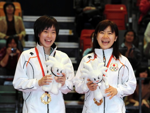 香港,2009年12月7日 (东亚运动会)乒乓球——福原爱/石川佳纯夺得女双冠军 12月7日,日本队选手福原爱(右)/石川佳纯在领奖台上。当日,在中国香港进行的东亚运动会乒乓球女双决赛中,福原爱/石川佳纯以4比2战胜队友藤井宽子/若宫三纱子,夺得冠军。 新华社记者黄本强摄