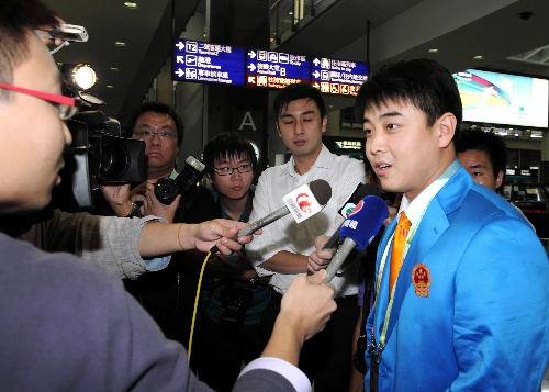 香港,2009年11月30日 (东亚运动会·香港)(1)中国部分运动员抵达香港 11月30日,中国乒乓球运动员王皓(右一)接受媒体采访。当日,参加东亚运动会的中国部分运动员抵达香港。 新华社记者黄本强摄