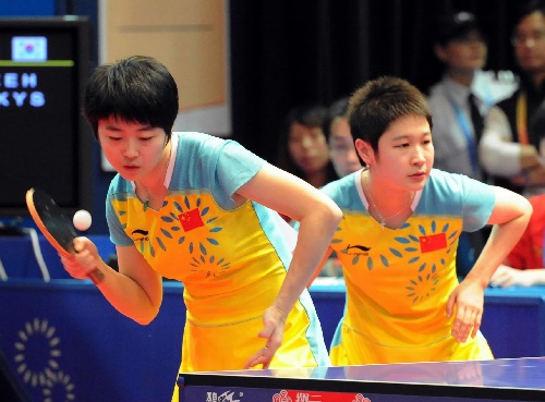 香港,2009年12月4日 (东亚运动会)(1)乒乓球——女双比赛赛况 12月4日,中国选手饶静文(左)/侯晓旭在比赛中。当日,在东亚运动会乒乓球女子双打比赛中,饶静文/侯晓旭以4比2战胜韩国选手李恩姬/朴英淑。 新华社记者黄本强摄