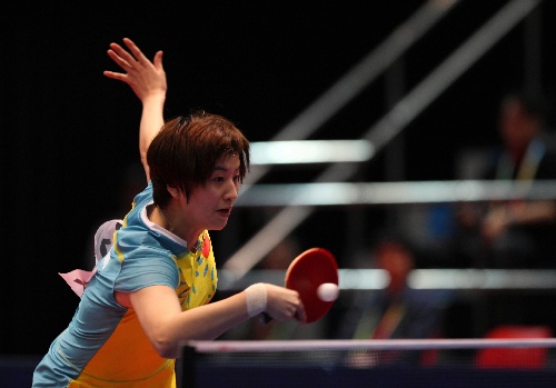 香港,2009年12月6日 (东亚运动会)(2)乒乓球——女单半决赛:姚彦胜石贺静 12月6日,中国队选手姚彦在比赛中回球。当日,在2009年东亚运动会乒乓球女子单打半决赛中,姚彦以4比3战胜韩国队选手石贺静,进入决赛。 新华社记者段卓力摄