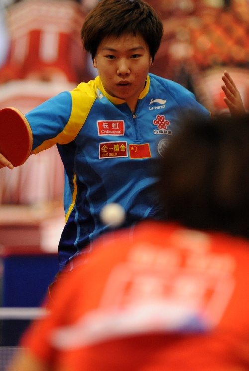南通(江苏),2010年2月3日   (体育)(3)乒乓球——“兵发莫斯科”选拔赛赛况 2月3日,李晓霞在比赛中回球。当日,在江苏南通中国乒乓球通州训练基地进行的中国乒乓球女队“兵发莫斯科”选拔赛循环赛中,李晓霞以2比3负于郭焱。 新华社记者韩瑜庆摄
