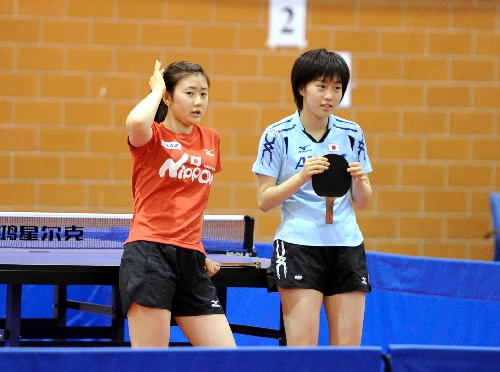 多哈,2010年2月19日 (体育)(3)乒乓球——卡塔尔公开赛正赛即将开始 2月18日,福原爱(左)和石川佳纯在赛前训练间隙。当日,日本选手福原爱和石川佳纯在多哈进行训练,备战将于2月19日在卡塔尔首都多哈开始的2010年国际乒联职业巡回赛卡塔尔公开赛的正赛。 新华社发(陈少金摄)
