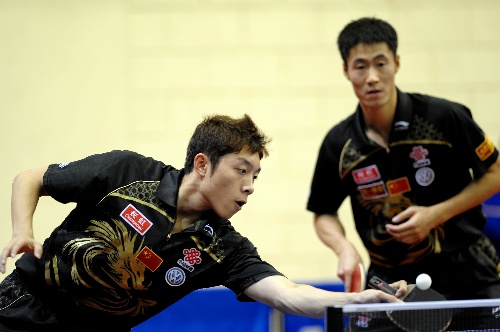 多哈,2010年2月20日 (体育)(1)乒乓球——卡塔尔公开赛:许昕/王励勤晋级男双八强 2月19日,中国选手许昕(左)/王励勤在比赛中。当日,在2010年国际乒联职业巡回赛卡塔尔公开赛男子双打第一轮比赛中,许昕/王励勤以4比0战胜斯洛伐克选手凯内斯/德国选手蒙格尔,晋级八强。   新华社发(陈少金摄)