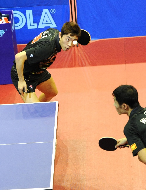 多哈,2010年2月20日   (体育)(2)乒乓球——卡塔尔公开赛:许昕/王励勤晋级男双八强 2月19日,中国选手许昕(上)/王励勤在比赛中。当日,在2010年国际乒联职业巡回赛卡塔尔公开赛男子双打第一轮比赛中,许昕/王励勤以4比0战胜斯洛伐克选手凯内斯/德国选手蒙格尔,晋级八强。   新华社发(陈少金摄)