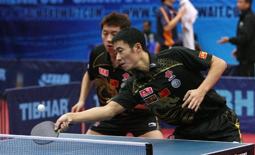 科威特城,2010年2月26日 (体育)乒乓球——科威特公开赛:王励勤/许昕晋级四强 2月26日,中国选手王励勤(右)/许昕在比赛中。当日,在2010年国际乒联职业巡回赛科威特公开赛男双比赛中,王励勤/许昕以4比0战胜巴尔托什(波兰)/德米特里(捷克),晋级半决赛。 新华社记者杜健摄
